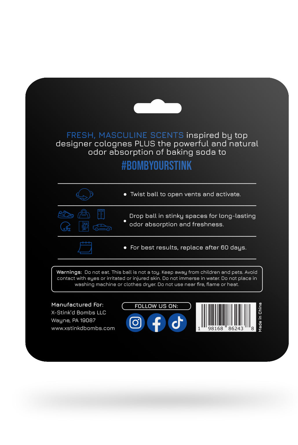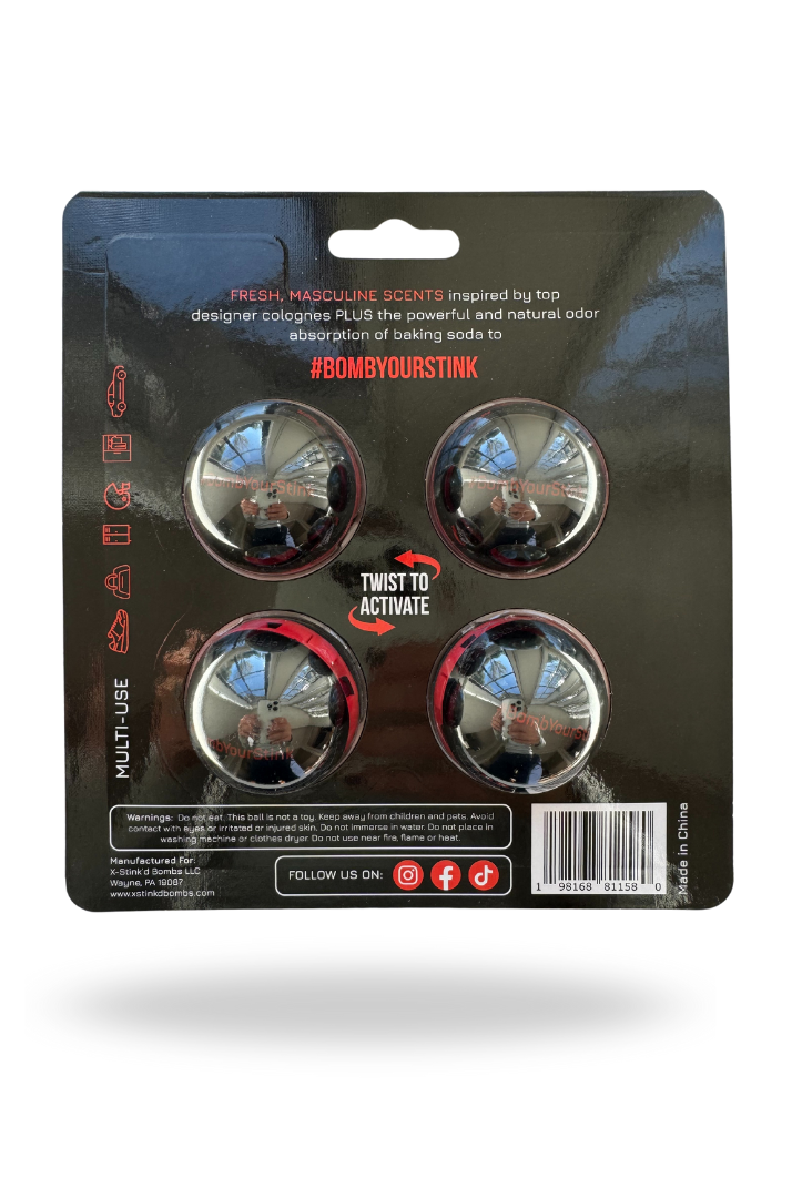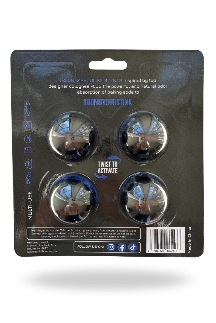 Fine fragrance infused deodorizer balls powered by baking soda for long-lasting odor absorption and a fresh, masculine scent.
