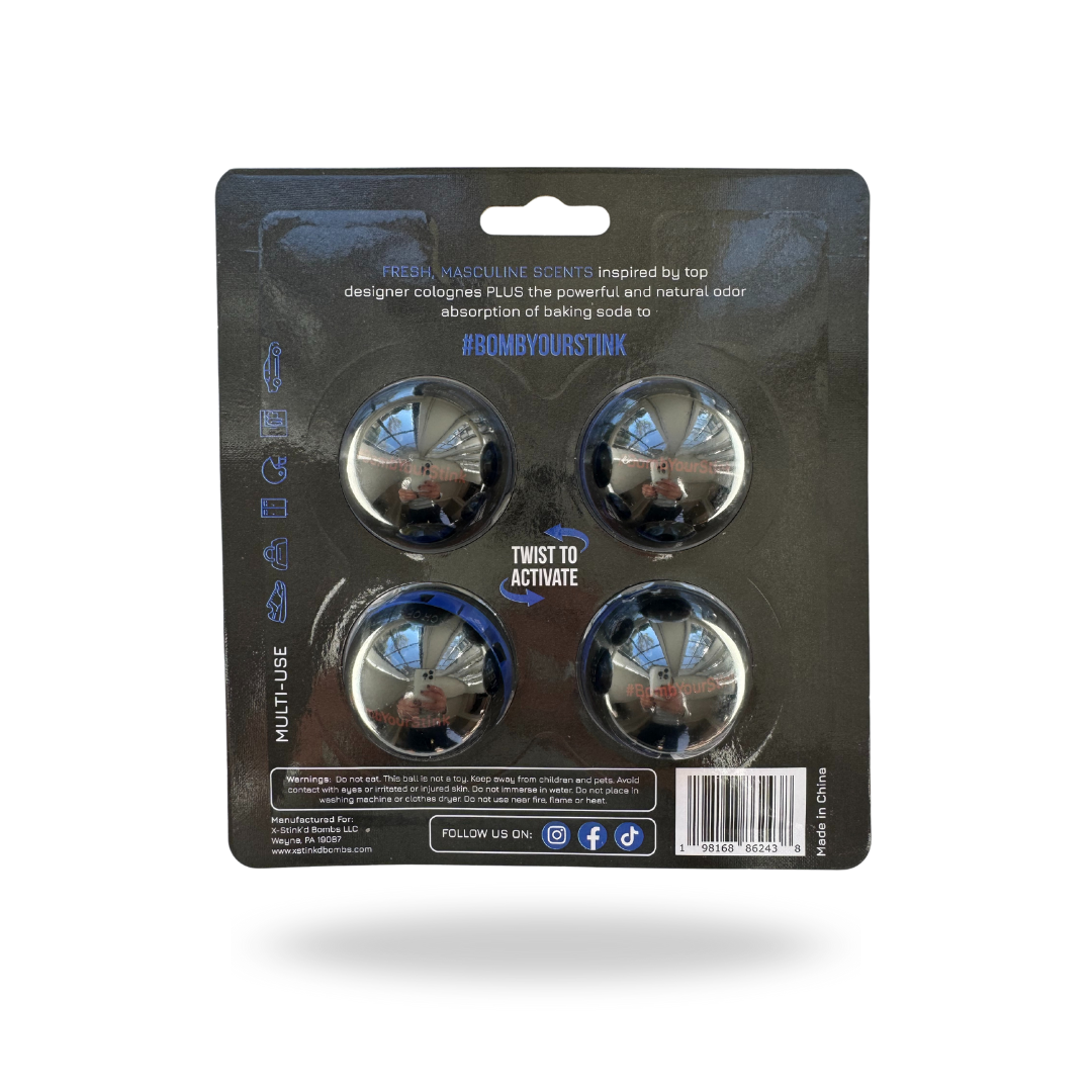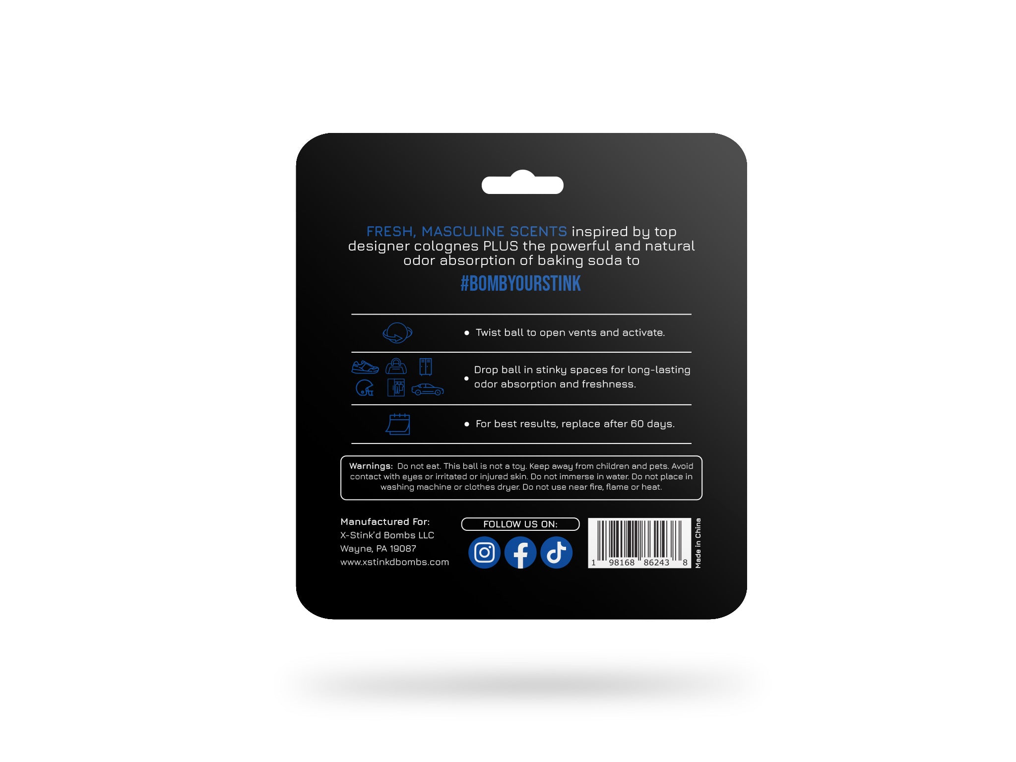 Fine fragrance infused deodorizer balls powered by baking soda for long-lasting odor absorption and a fresh, masculine scent.